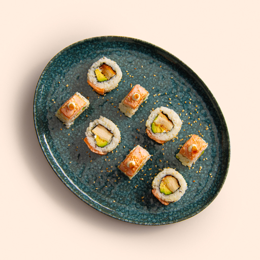 POLLO REBOZADO,QUESO,SALMÓN FLAMEADO, SALSA TERIYAKI,MAYONESA
