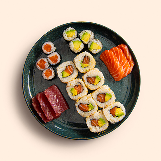 8 URA SALMÓN Y QUESO 4 MAKI SALMÓN, 4 MAKI AGUACATE 3 SASHIMI SALMÓN, 3 SASHIMI ATÚN